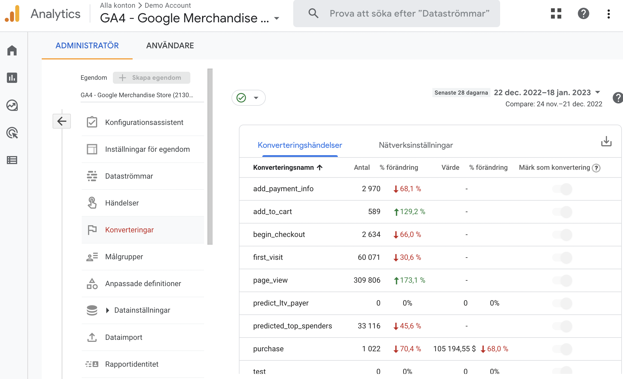 Mål är en funktion som finns i gamla versionen av Google Analytics som har ersatts med ”Conversions” (Konverteringar) i GA4. De fyller samma syfte men uppsättningen är lite annorlunda. I GA4 bygger allt på händelser som sedan kan registreras som Konverteringar istället.