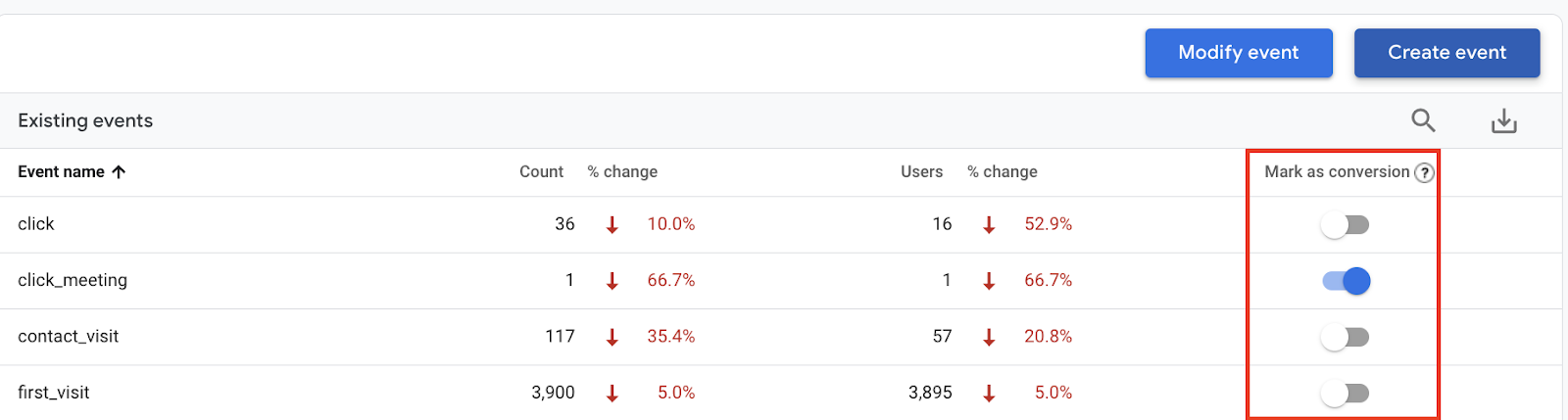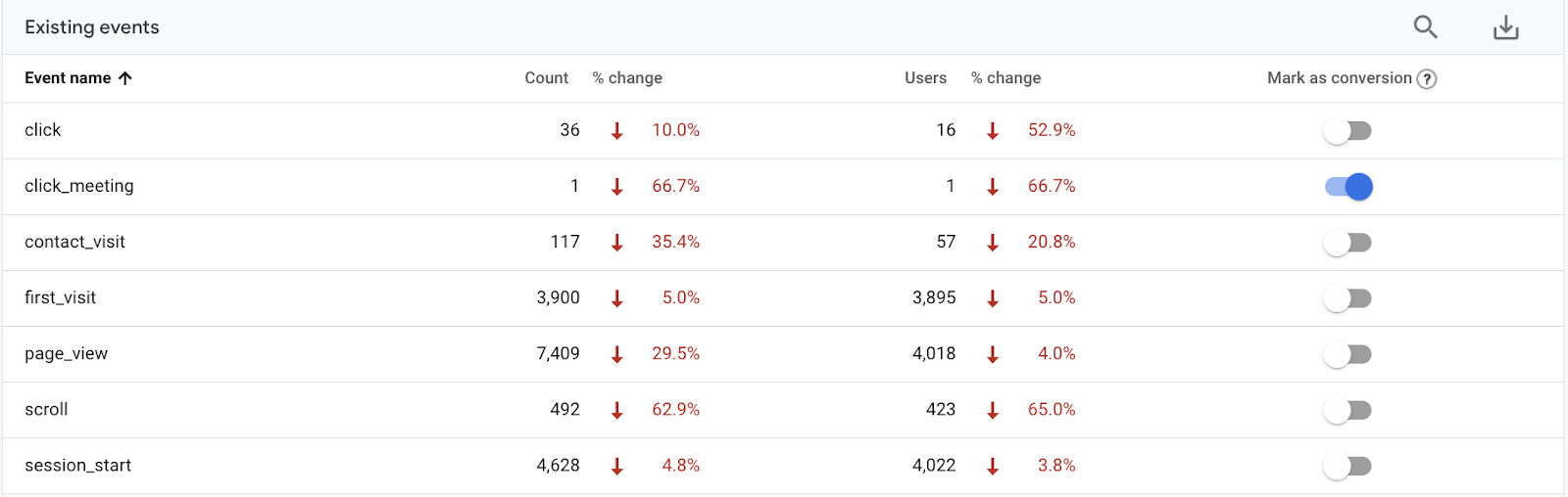 I ovan utlösare har vi begränsat formulär sändningen att bara utlösas om den sker på en webbsida som har en URL som innehåller “/contact/. När du har skapat din anpassade händelse i GTM kommer den automatiskt att dyka upp bland händelser i GA4 när den har inträffat. Vill du att den ska klassas som konvertering i GA4 kan du antingen vänta tills händelsen dyker upp i GA4 och sedan i vyn för händelser markera den som konvertering genom att klicka på den lilla knappen längst till höger.