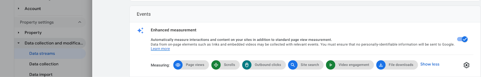 Här finns t.ex. filnedladdningar, scrollning, video engagemang mm. Min rekommendation om du inte har aktiverat dessa är att aktivera alla. Dessa händelser är inte 100% i uppsättningen och kan mäta fel men det ger i 9 av 10 fall en bättre spårning än om man inte har något uppsatt alls.