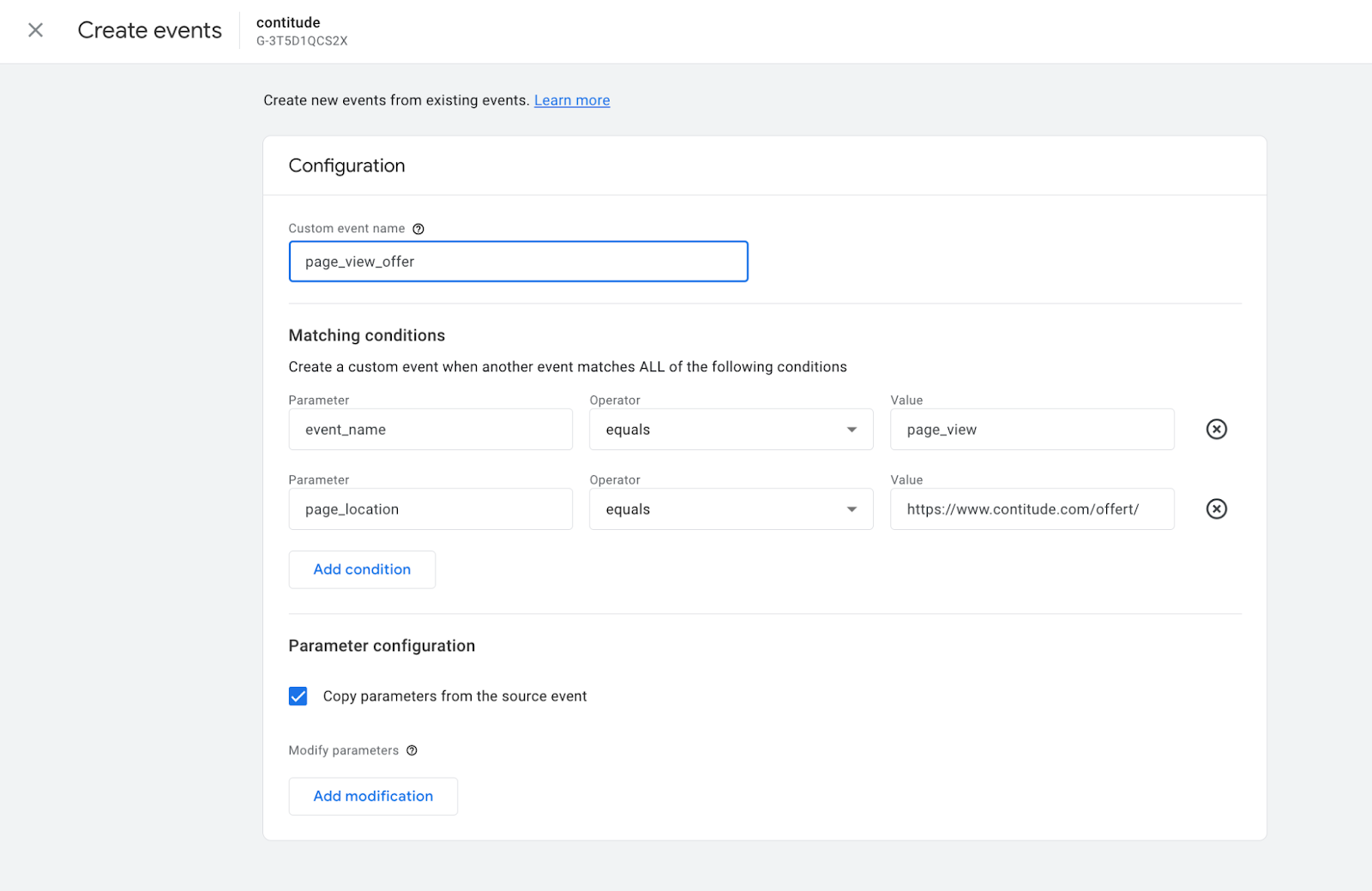Och sedan väljer skapa event. Där kan man lätt skapa en unik händelse som bygger på någon av de standardhändelserna som finns i Google Analytics. T.ex. kan man skapa specifik händelse när att en användare har besökt en specifik sida. Se nedan bild för ett exempel på att landa på sidan: https://www.contitude.com/offert/ genom att ställa in standardhändelserna, page_view med standardparametern page_location.