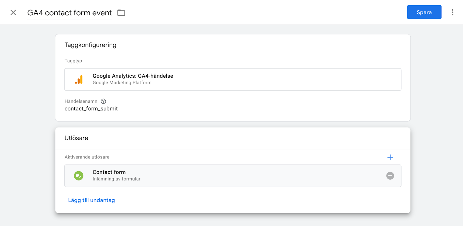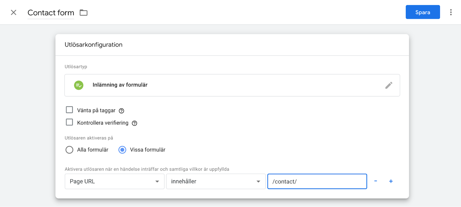 Det sätt som vi på Contitude brukar rekommendera att använda är att skapa anpassade händelser och sedan skicka dessa till Google Analytics. Google Tag Manager, GTM, är liksom Google Analytics ett gratis verktyg från Google och används för att lägga in olika script på en webbplats men även skapa anpassade händelser. GTM bygger på utlösare och taggar. Där utlösare är stället där man beskriver när något ska ske och taggen är vad som ska ske. Ett exempel på en utlösare kan vara när ett specifikt formulär skickas in och taggen som är kopplad till den utlösaren kan vara ett Google Analytics event som döpts till “contact_form_submit”. Nedan ser du ett exempel på denna utlösaren och taggen.