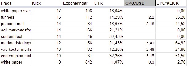 När både antalet klick på en sökterm och uppskattad cost per click för den söktermen finns på plats är det lätt att summera vad kostnaden hade varit för alla dessa klick på de söktermerna.Se bilden nedan för ett litet utdrag av vår uträkning: