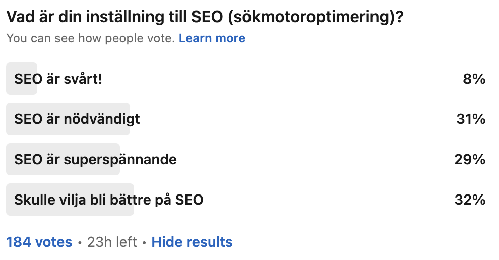 Summan av kardemumman är att majoriteten tycker att SEO är spännande och nödvändigt. Hela 40% tycker att det är svårt och vill bli bättre på SEO. Det är otroligt roligt att så många vill engagera sig mer i SEO och bli bättre på det. Många som vill bli bättre på SEO funderar nog på vart de skall börja.